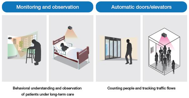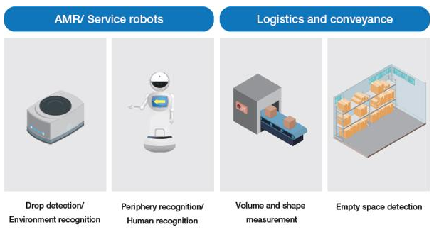 自主機(jī)器人不僅被用于工業(yè)應(yīng)用,如工廠和配送倉庫的運(yùn)輸,還應(yīng)用于公共設(shè)施、醫(yī)院、火車站和商業(yè)綜合體。除了簡單的任務(wù),如運(yùn)輸,包括手臂應(yīng)該使機(jī)器人從事更高級的任務(wù),如組件組裝。在這種多變的環(huán)境中,三維視覺傳感器能夠準(zhǔn)確地檢測周圍環(huán)境,以避開人、障礙物和不平的表面,從而實(shí)現(xiàn)機(jī)器和設(shè)備的自主操作。然而,傳統(tǒng)應(yīng)用中使用的攝像機(jī)和2D激光雷達(dá)的探測范圍有限,需要多個(gè)設(shè)備的組合,這就帶來了復(fù)雜結(jié)構(gòu)的挑戰(zhàn)。