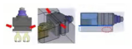 “通過卡槽定位裝配”D2GW開關(guān)與客戶部件裝配時,開關(guān)本體的卡槽作為定位并可卡入,裝配十分簡易。并且和其他通過定位柱或定位孔安裝的產(chǎn)品相比,通過卡槽與客戶部件裝配,可以使客戶的部件設(shè)計更加小巧。