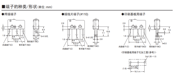 2、微動開關(guān)外形尺寸和端子的種類也是很重要: