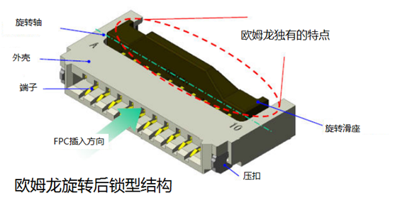一、 旋轉(zhuǎn)式滑座從FPC插入口獨(dú)立出來。這樣一來,提起FPC時(shí),滑座并不會斷開。這就保證了即使受到過度的外力,安裝好的FPC也不會脫開。