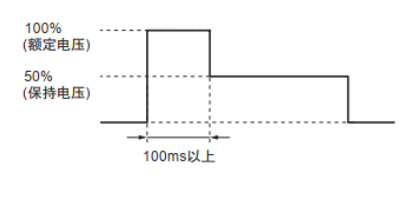 其中保持電壓需要注意的點(diǎn)是繼電器動(dòng)作后將線圈電壓降低至保持電壓使用時(shí),請(qǐng)如下圖所示,首先對(duì)線圈施加額定電壓100ms以上,且線圈保持電壓需為額定電壓的50%以上,避免因線圈電壓變動(dòng)等爾低于該值。