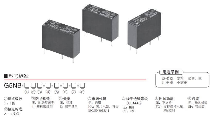 G5NB功率繼電器具有耐沖擊電壓10KV的1極3A/5A開閉的小型繼電器,采用了高功率電磁回路,實現(xiàn)了高靈敏(200mW),標(biāo)準(zhǔn)品還取得了UL、CSA、VDE認(rèn)證,在使用上符合EN61010強化絕緣標(biāo)準(zhǔn),還支持保持電壓、PWM控制,有助于節(jié)能(G5NB-( )-PW型)