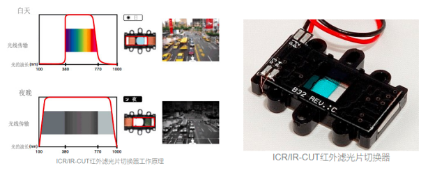 IR-CUT 或者ICR Filter中文名為紅外濾光片切換器, 或紅外截止濾光片,是所有紅外監(jiān)控攝像頭必備的一個小部件,此部件位于鏡頭和圖像傳感器的中間,紅外濾光片主要包括濾光片和驅動線圈組成。每當監(jiān)控攝像頭進行日夜切換時,IR CUT將動作,用戶常常會聽到“滴”的切換聲。那到底IR CUT工作原理是什么? 有什么用呢?