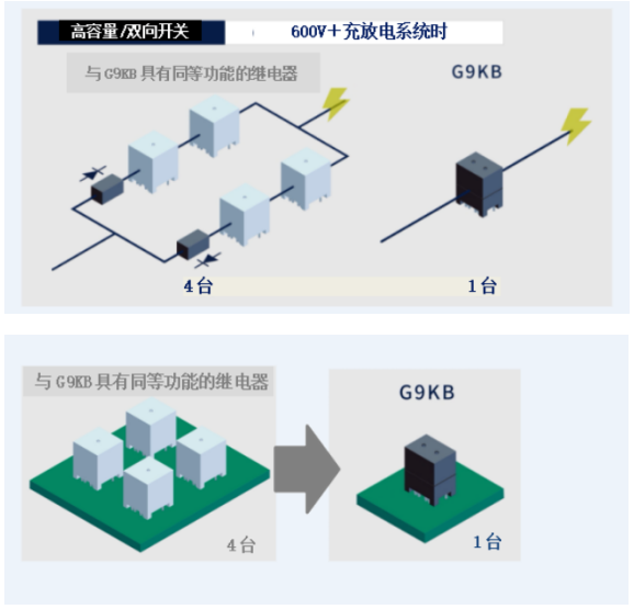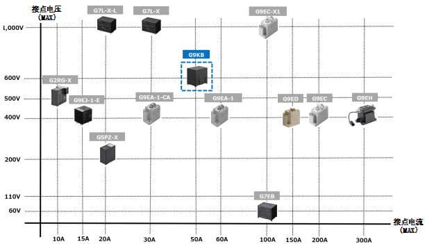 下面是歐姆龍直流高容量繼電器產(chǎn)品陣容圖(藍(lán)框為本次發(fā)售的G9KB)