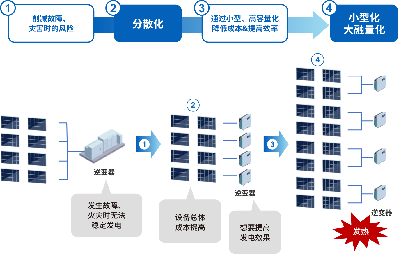 近年來,太陽能發(fā)電系統(tǒng)上的需求不斷發(fā)生變化。作為地震或水災(zāi)等災(zāi)害風(fēng)險對策,更加穩(wěn)定的電力供給需求愈發(fā)高漲,并出現(xiàn)了從集中型系統(tǒng)向分散型系統(tǒng)轉(zhuǎn)化的趨勢。并非通過1臺光伏逆變器執(zhí)行電力轉(zhuǎn)換,而是分散至多臺光伏逆變器,由此降低了發(fā)生災(zāi)害時因設(shè)備故障等所致發(fā)電停止的風(fēng)險。此外,各設(shè)備或機(jī)器上通過高容量、大電流化的配置提高了發(fā)電效率,并通過小型化、輕量化削減了設(shè)備投資,因而要求有效利用設(shè)備的呼聲愈發(fā)高漲。而另一方面,伴隨小型化、高容量化的發(fā)展,當(dāng)務(wù)之急是減少設(shè)備本身產(chǎn)生的熱量,這是造成能量損失和降低設(shè)備使用壽命的一個因素。