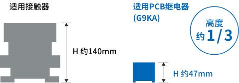 為了解決這個發(fā)熱課題而開發(fā)的產(chǎn)品便是G9KA型高容量功率繼電器。G9KA在行業(yè)內(nèi)實現(xiàn)低接觸電阻0.2mΩ,有效抑制了作為小型化、高容量化重大課題的發(fā)熱。此外,與同等電流容量的接觸器相比,高度采用只有其1/3左右的緊湊型尺寸,有助于實現(xiàn)設(shè)備的小型化、省空間化。
