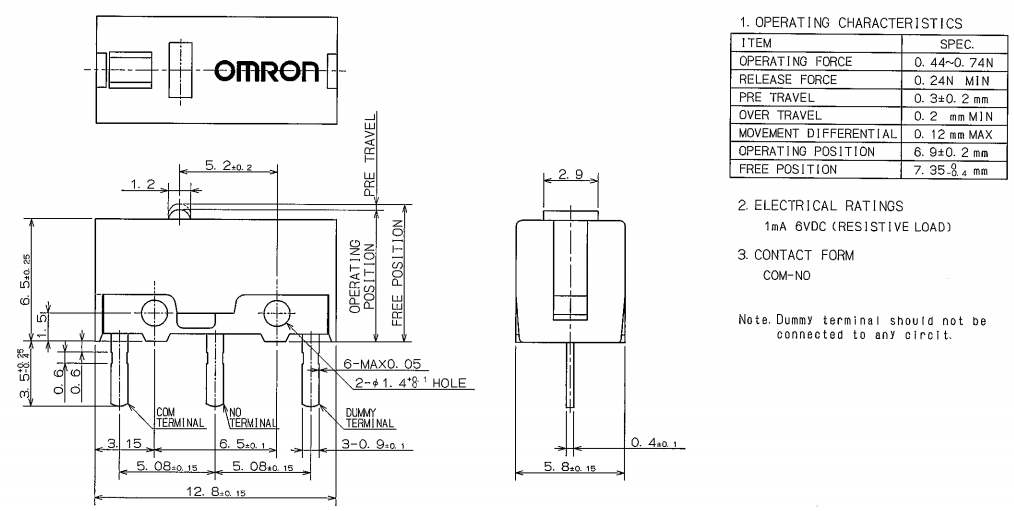 D2FC-F-7N, 克力為:60+/-15G,壽命為500萬次;