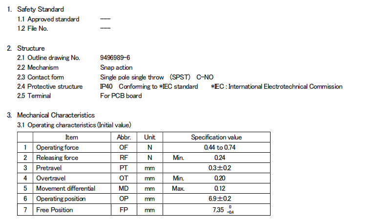 D2FC-F-7N (20M) 克力為:60+/-15G,壽命為2000萬次;