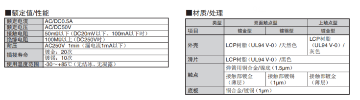 接點構(gòu)造備有雙面觸點型和上觸點型兩種。 (上接點型只有0.5mm間距)